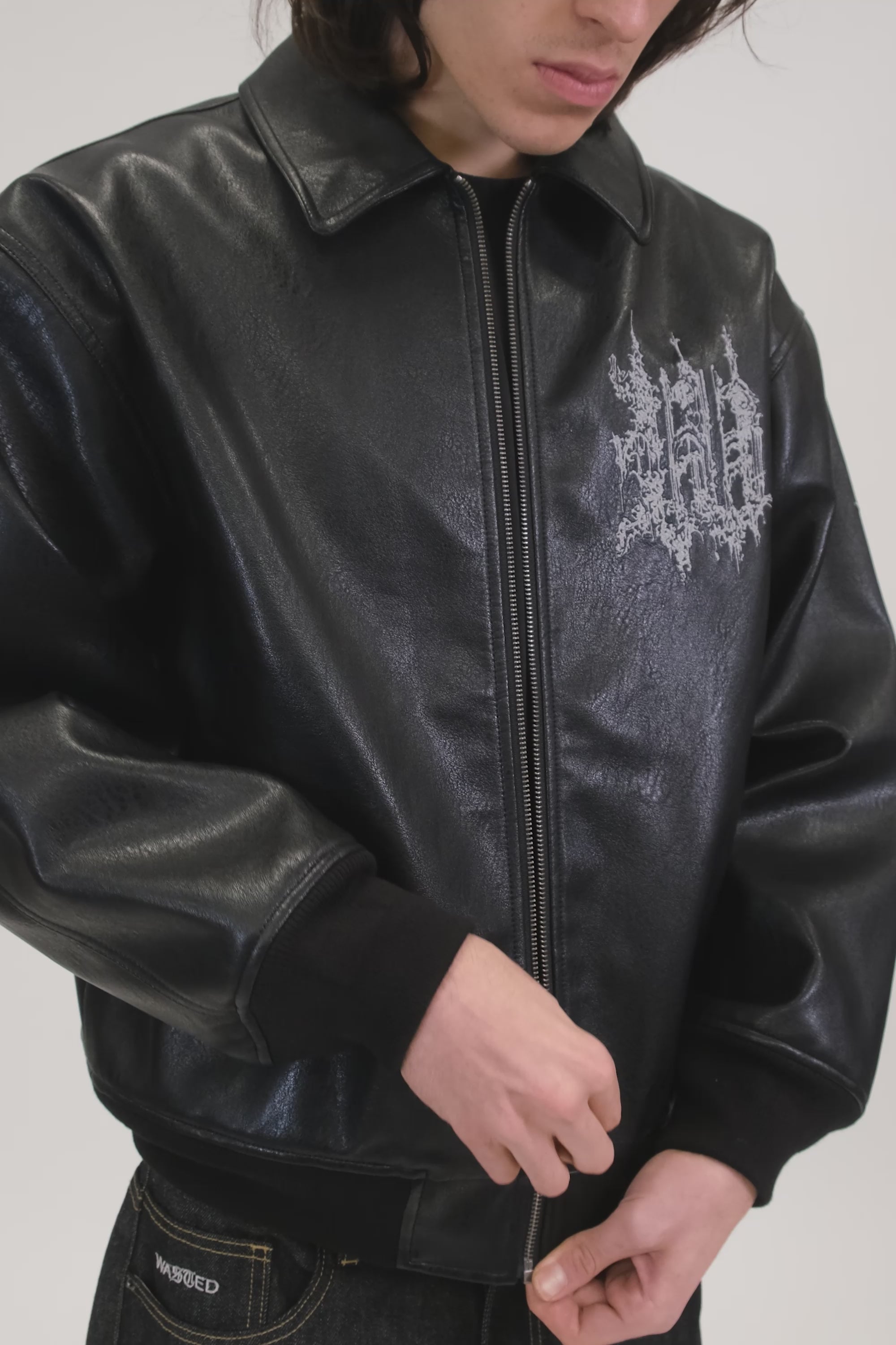 Notre Varsity Jacket Stronghold est une varsity en faux cuir à coupe boxy, avec de fines broderies réfléchissantes devant sur le coeur et dans le dos.